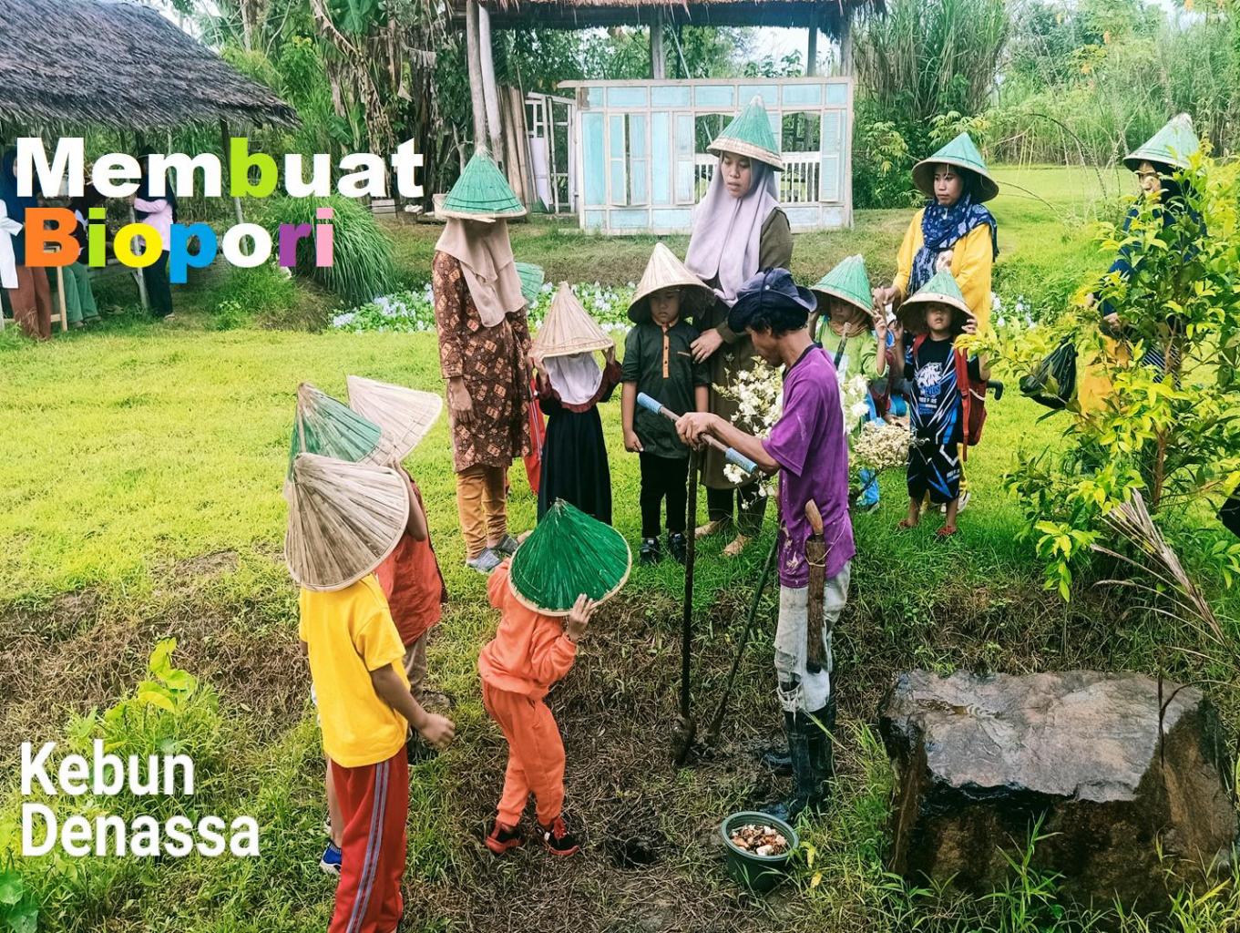 Agar pengunjung yang belajar ke Kebun Denassa terdorong memanfaatkan limbah domestik dan daun menjadi pupuk kami ajak langsung praktik membuat biopori.