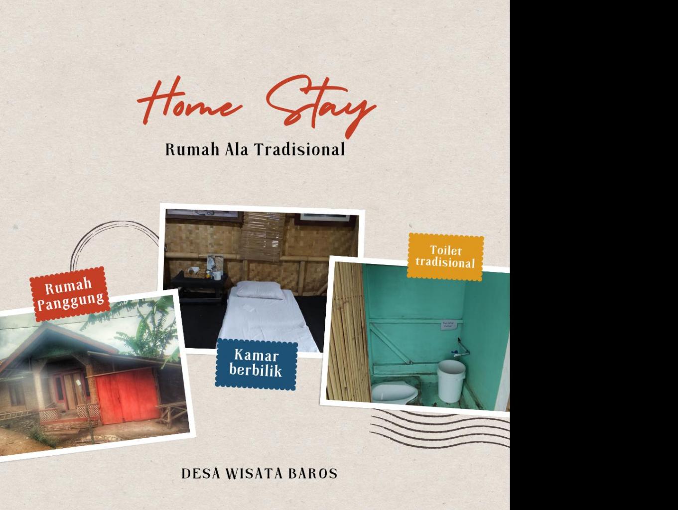 home stay yang ada di wisata desa baros berjenis rumah panggung ala tradisional khas sunda dengan menggunakan rumah pribadi para penduduk sekitar untuk menampung wisatawan yang ingin bermalam di wisata desa baros.