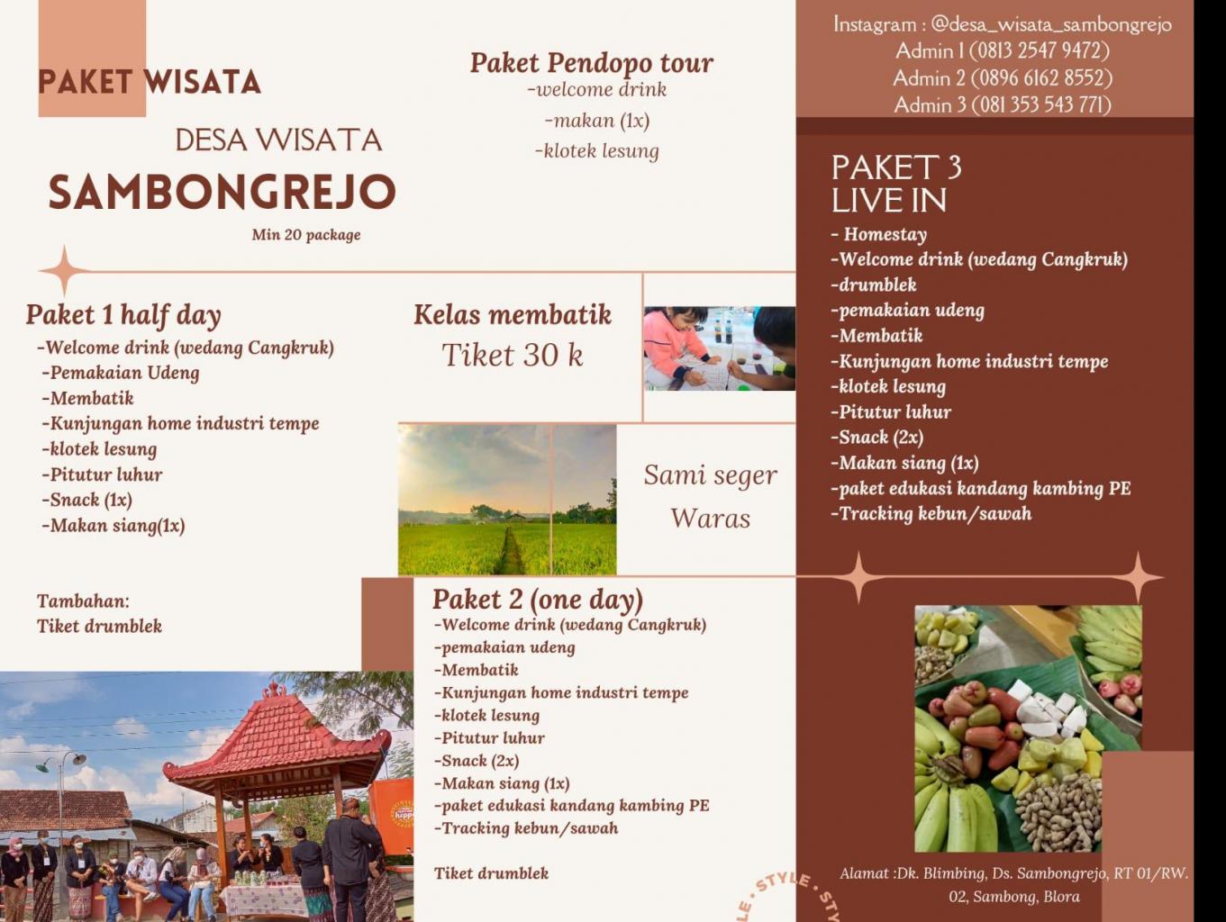 Desa Wisata Sambongrejo menyediakan berbagai macam Paket Wisata mulai dari Paket half day, one day dan Live in dengan fasilitas berbagai macam pilihan. Desa Wisata Sambongrejo juga menyediakan paket MICE dengan menggunakan Pendopo Sedulur Sikep dengan kapasitas hingga 150 orang.